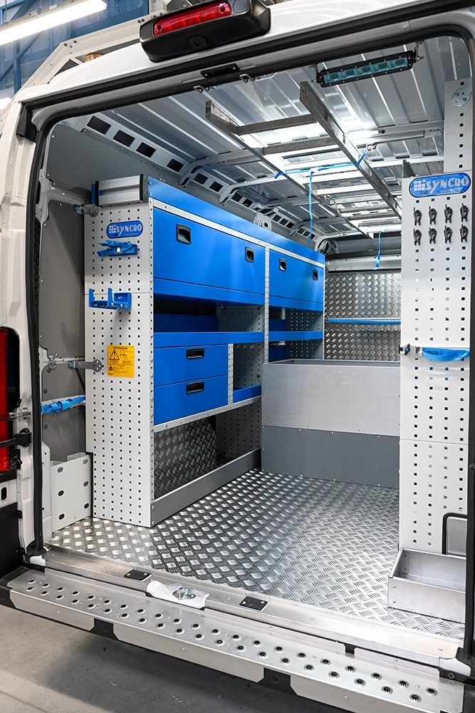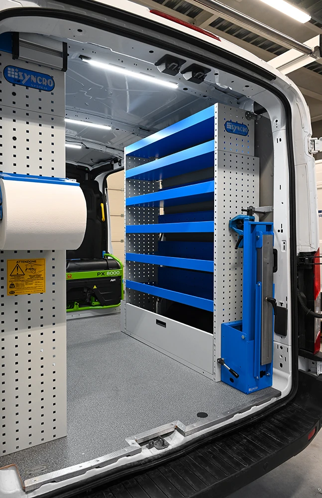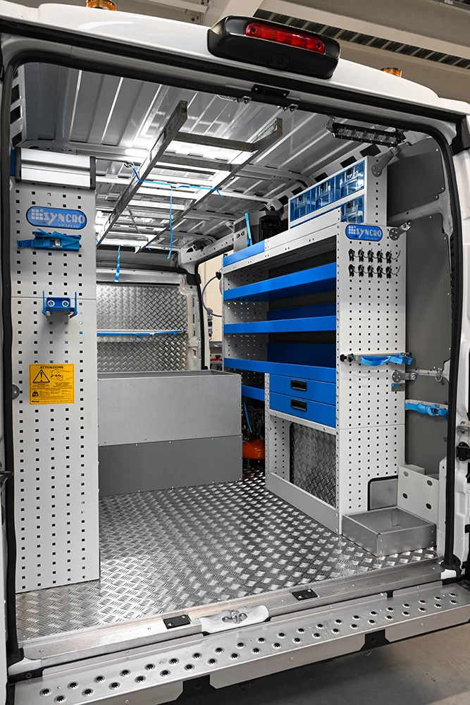 ¿Cómo distribuir el espacio en la furgoneta? Las posibilidades con Syncro son infinitas; la dificultad de elección se supera poniendo en línea las necesidades operativas, los espacios efectivos y la frecuencia de uso de los distintos componentes a introducir.