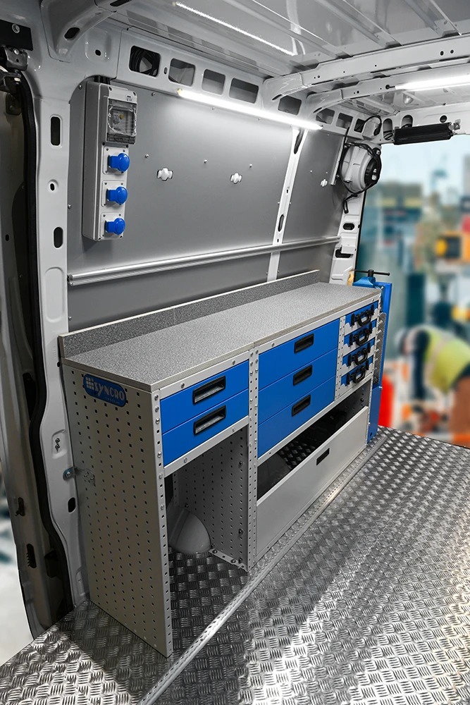 Los estantes en multicapa permiten utilizar un sólido banco de trabajo incorporado en el equipamiento de la furgoneta.