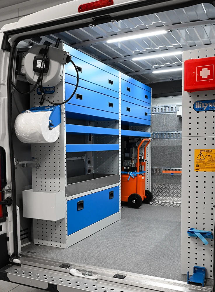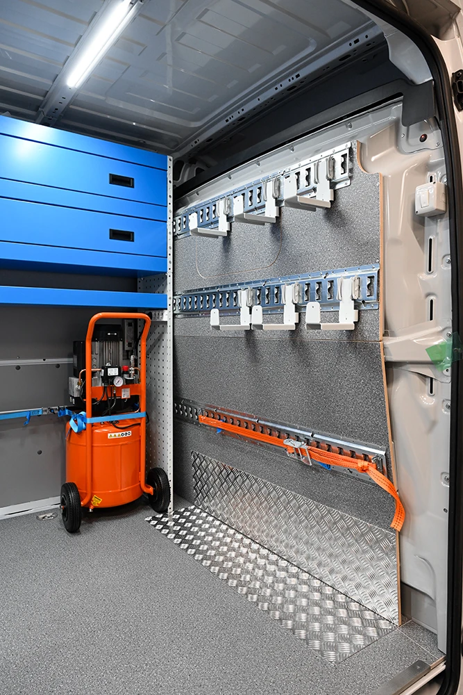En el Ducato L2 H2 para el mantenimiento de carretillas elevadoras, dos equipos, además del amplio almacén, contribuyen a satisfacer la mayoría de las necesidades de autonomía del cliente: un compresor portátil, potente pero ligero y utilizable incluso fuera de la furgoneta, y un bobinador para la distribución del aire comprimido.