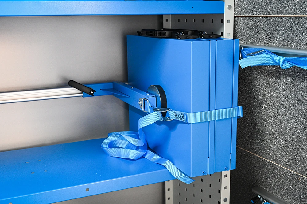 - una barra Syncroblock de aluminio con carril para el anclaje de correas y accesorios. Se puede montar en la pared detrás del estante, utilizando los orificios posteriores de los laterales; o en la parte superior, directamente en el estante y con el posible soporte de soportes si la parte superior está compuesta por cajones o bandejas;