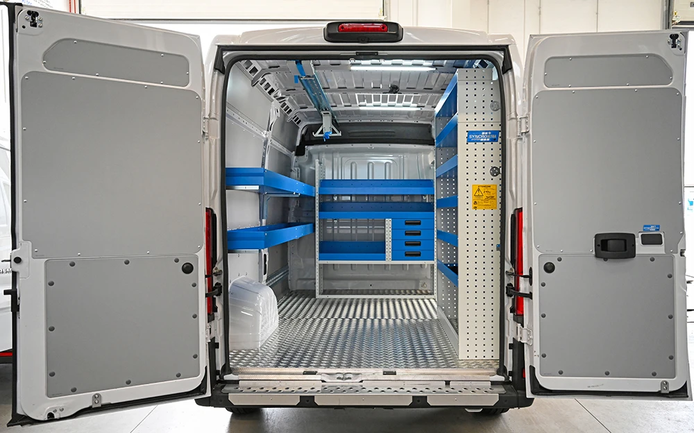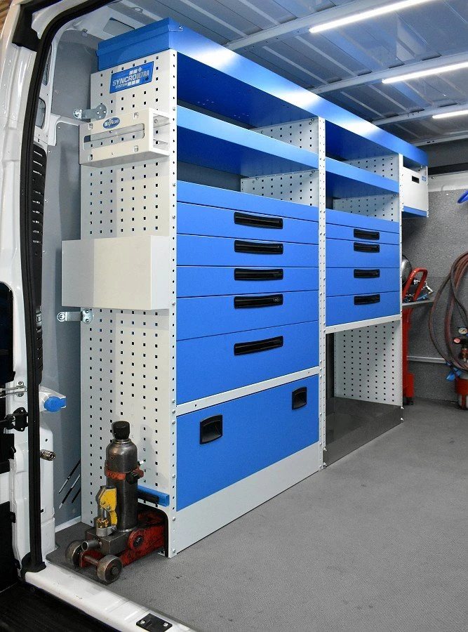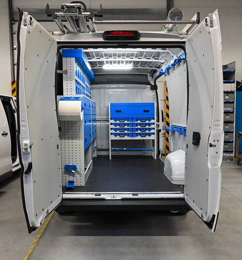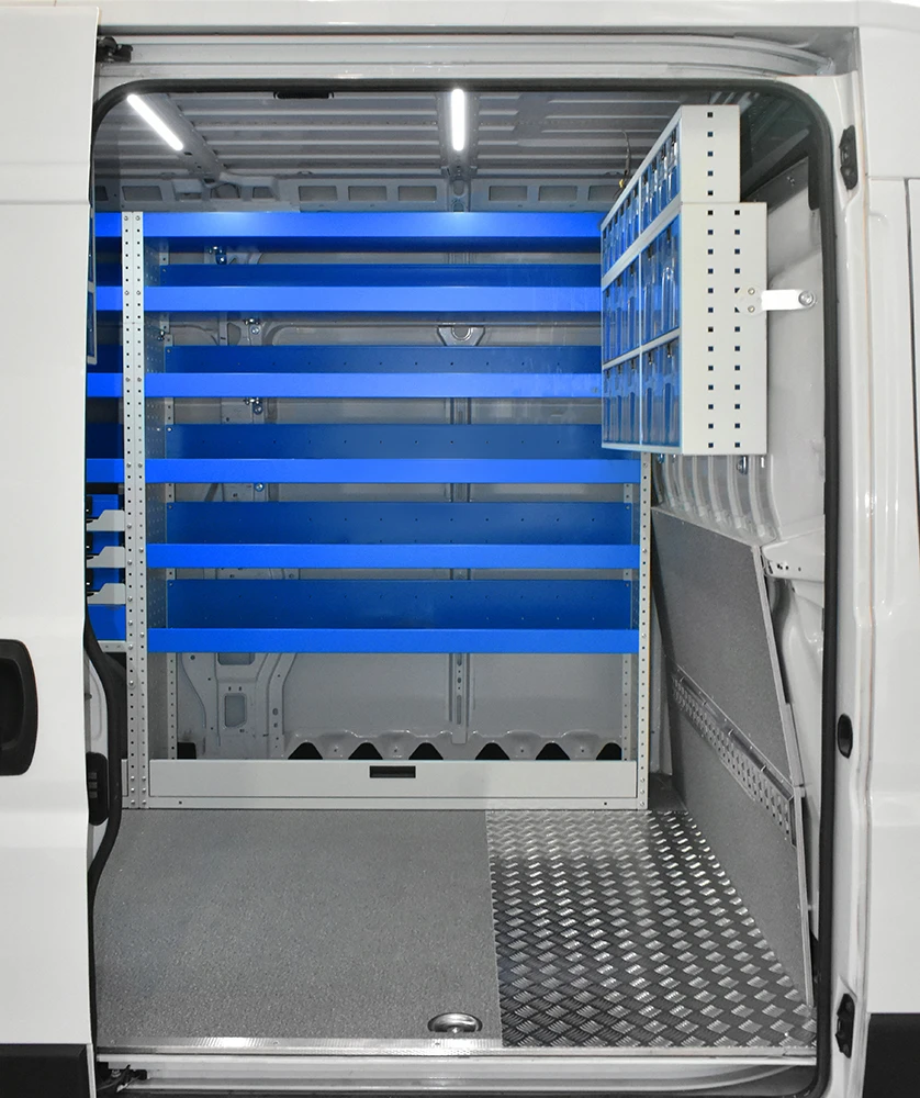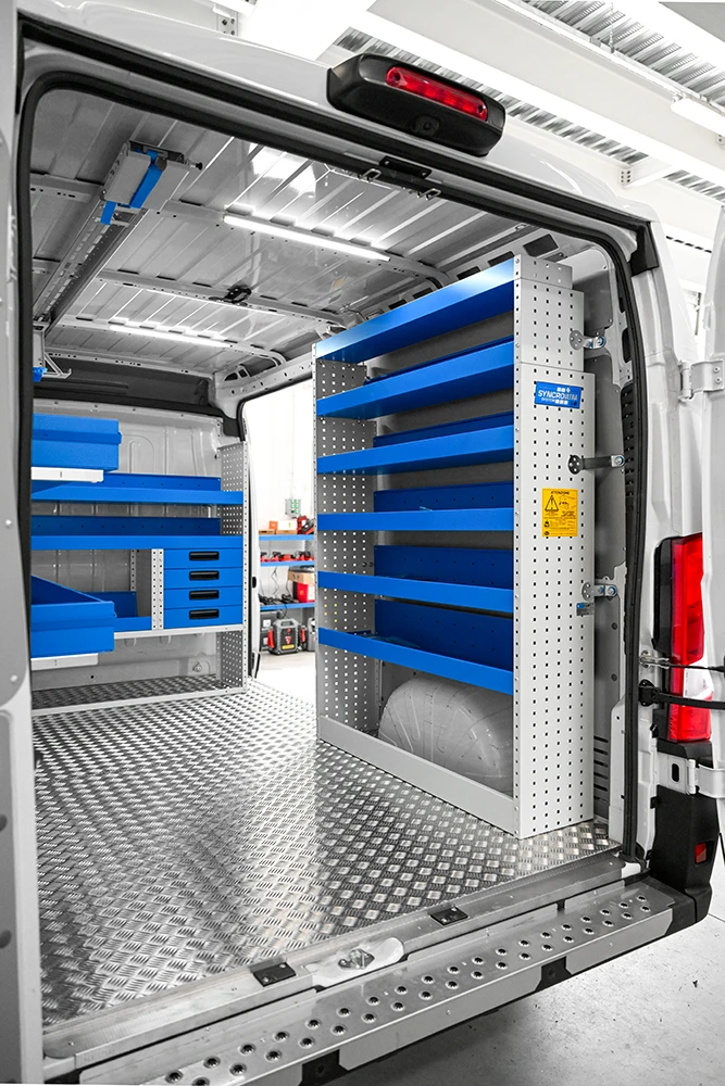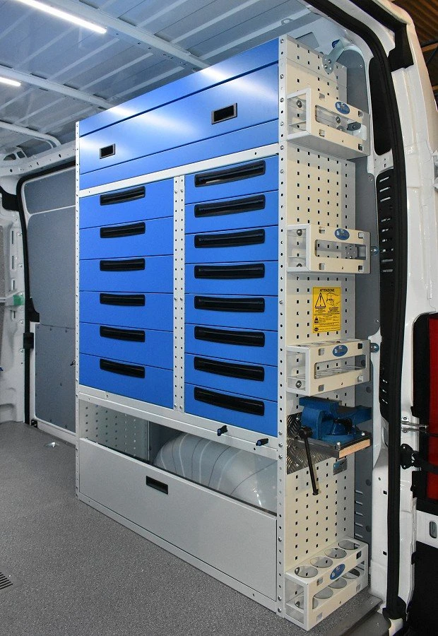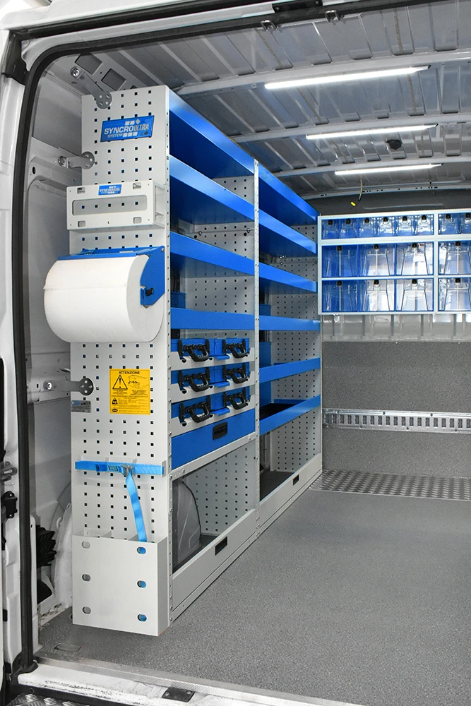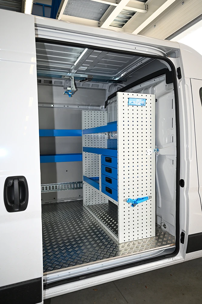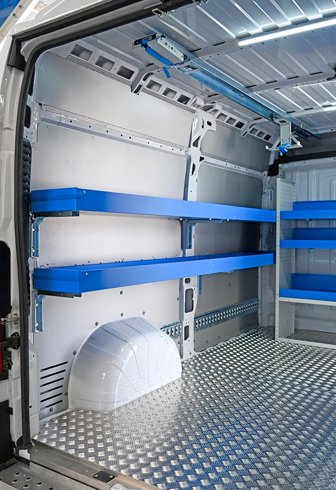 Equipamientos para furgonetas Opel Movano con estanterías y cajoneras modulares, prácticas y funcionales.