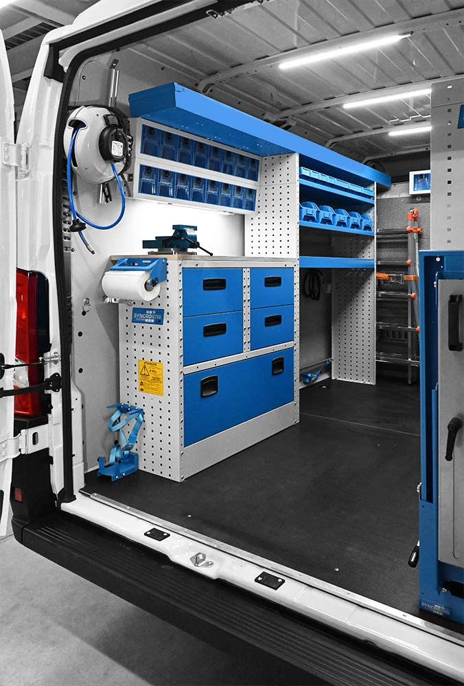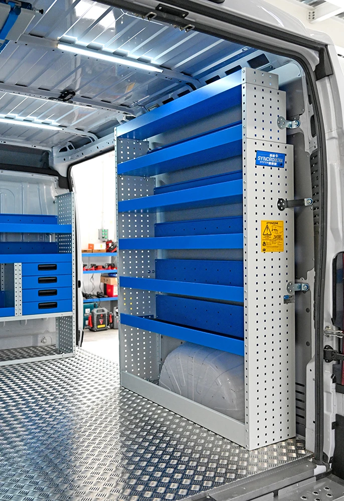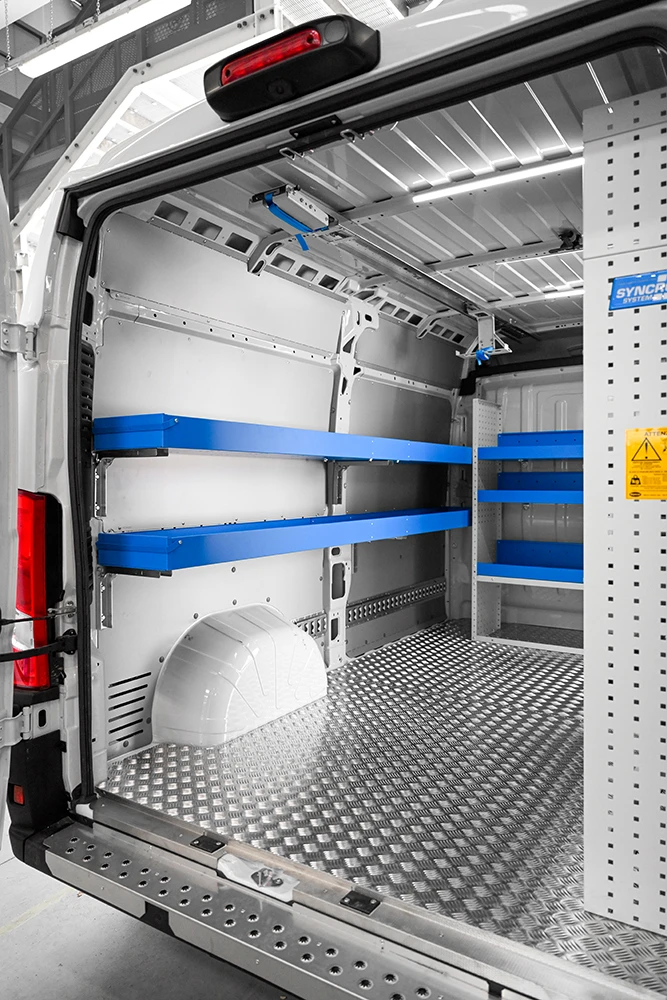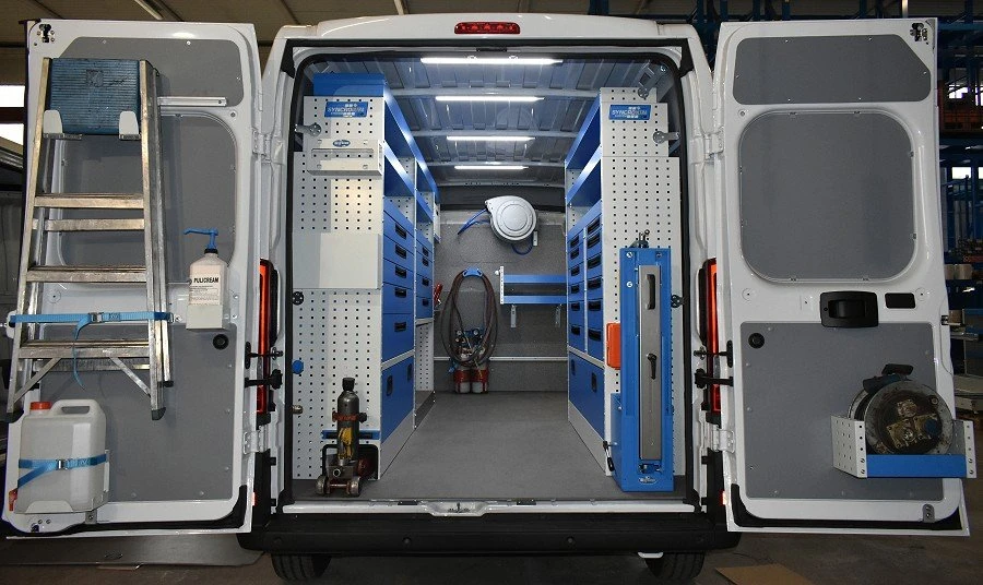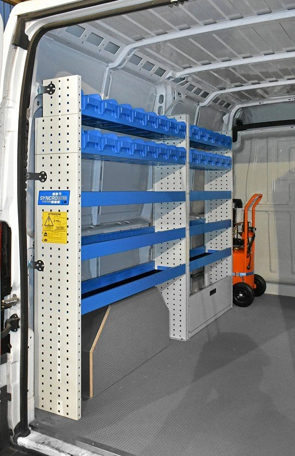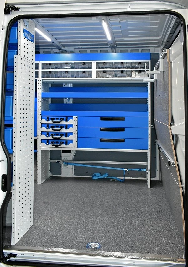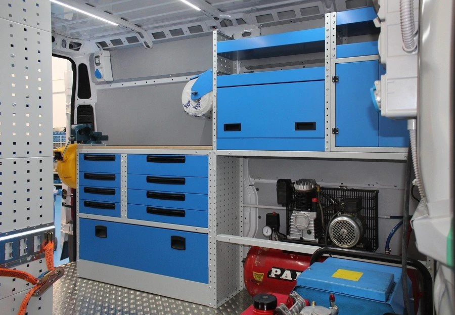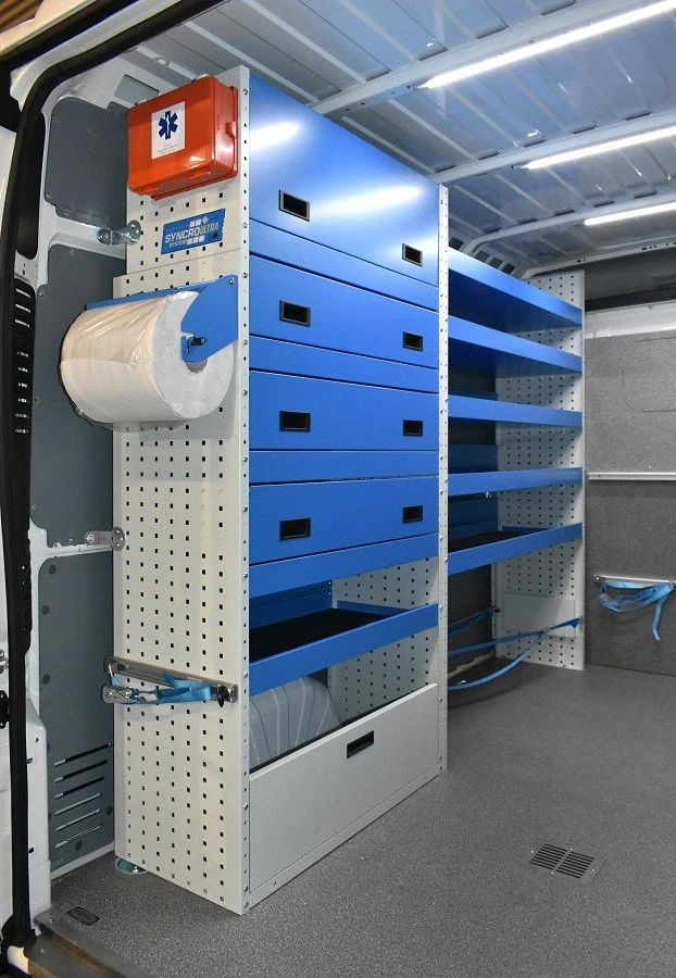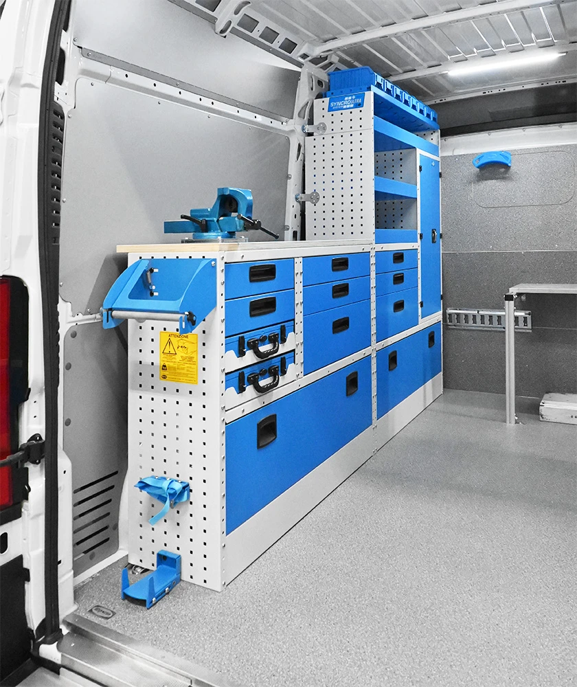 Equipamientos para furgonetas Opel Movano con estanterías y cajoneras modulares, prácticas y funcionales.