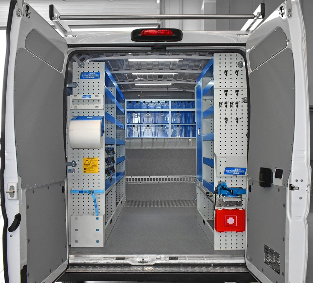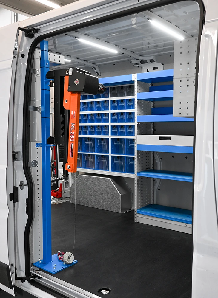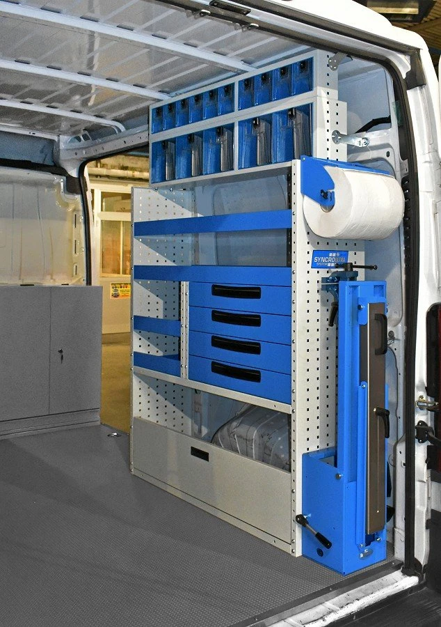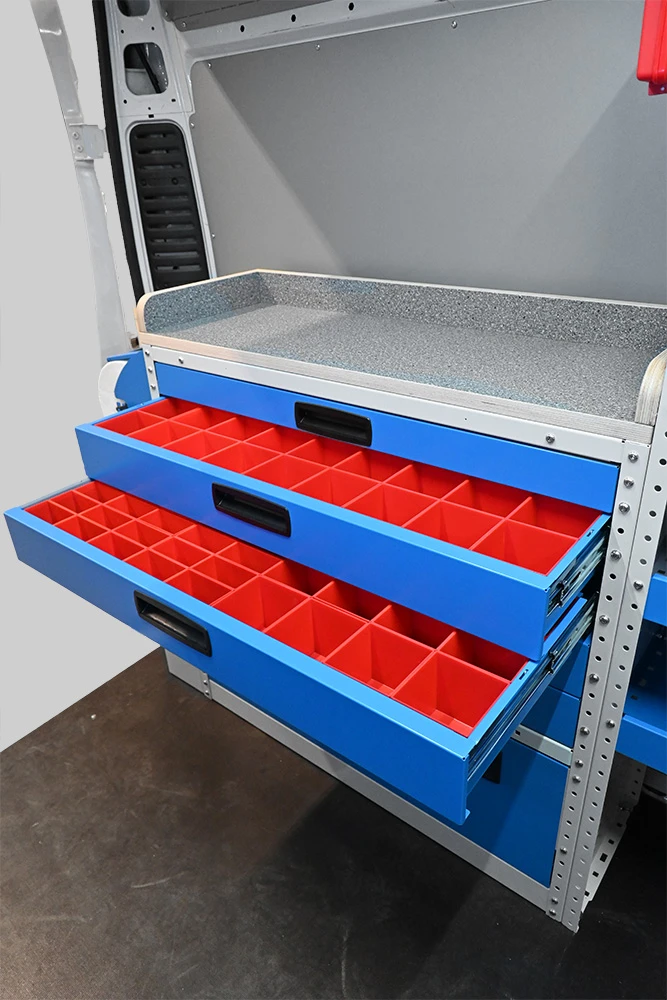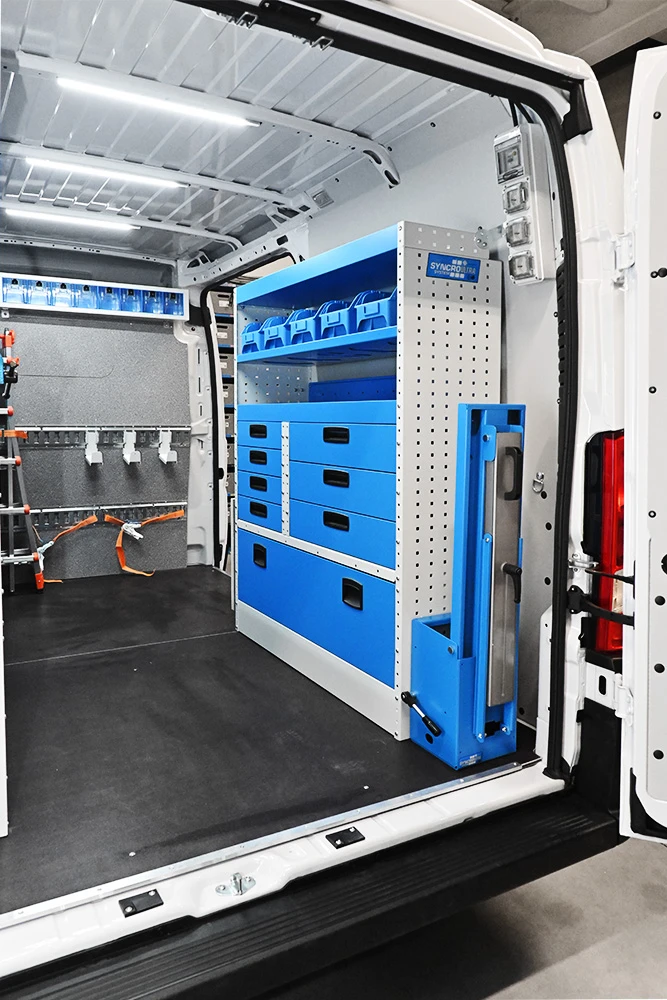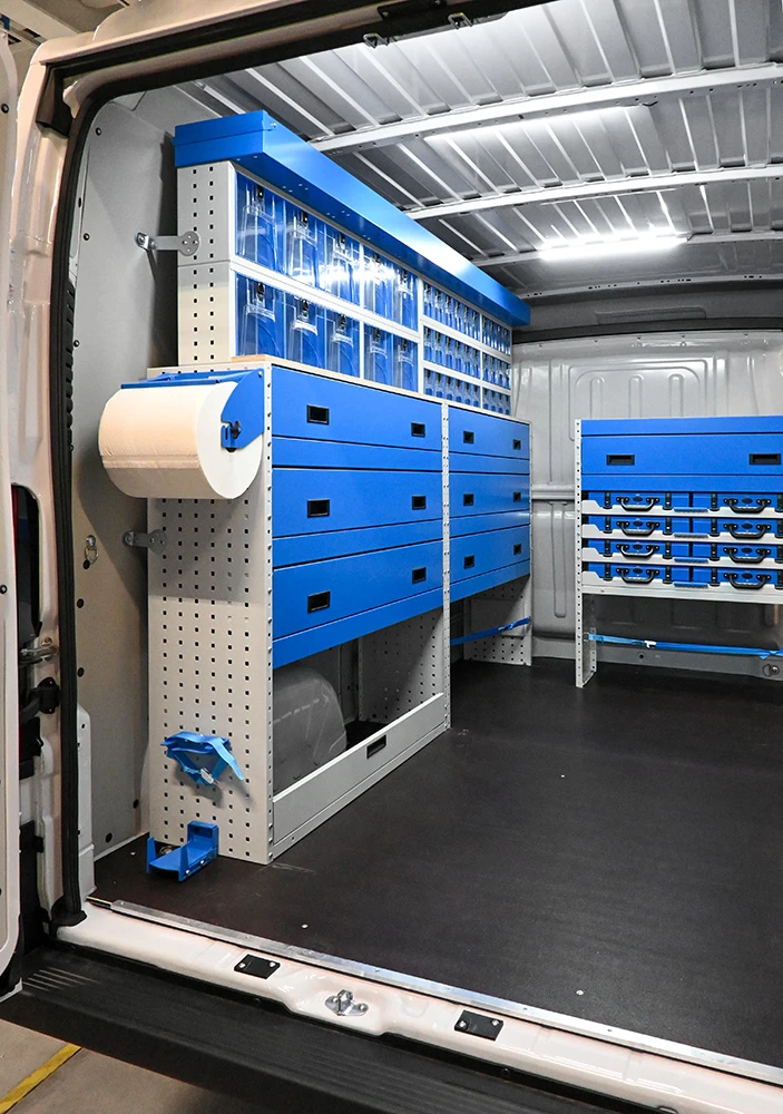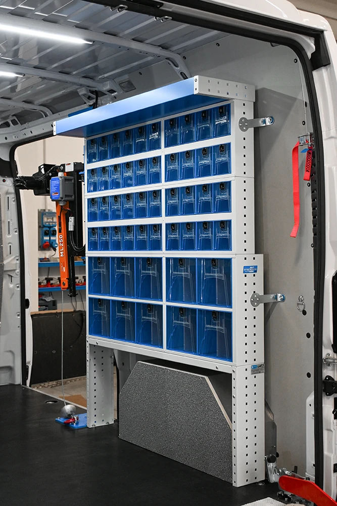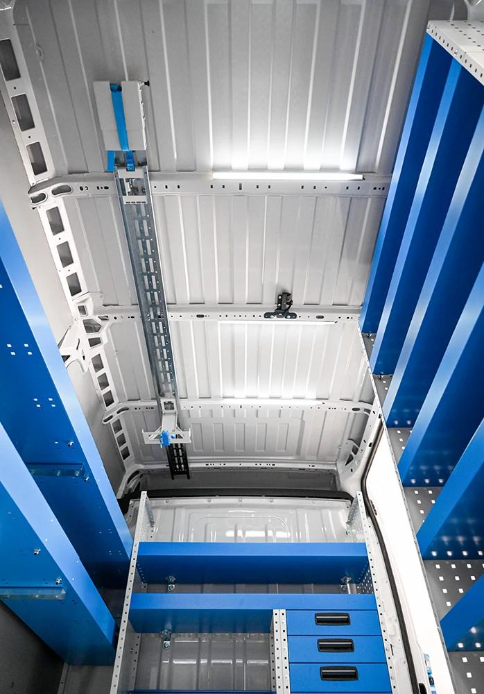 Equipamientos para furgonetas Opel Movano con estanterías y cajoneras modulares, prácticas y funcionales.